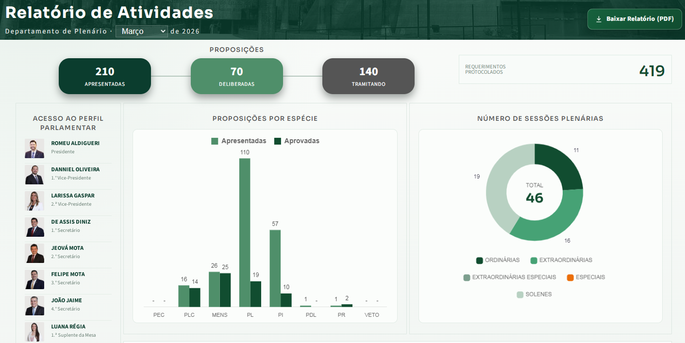 O formato de dashboard, como painel de controle com interface gráfica que consolida indicadores de desempenho e dados em uma única tela, facilita esse processo. Nele, os dados disponibilizados são atualizados mensalmente, de acordo com a produção legislativa da Casa. É possível ver o desempenho de cada parlamentar, assim como de todos os partidos.