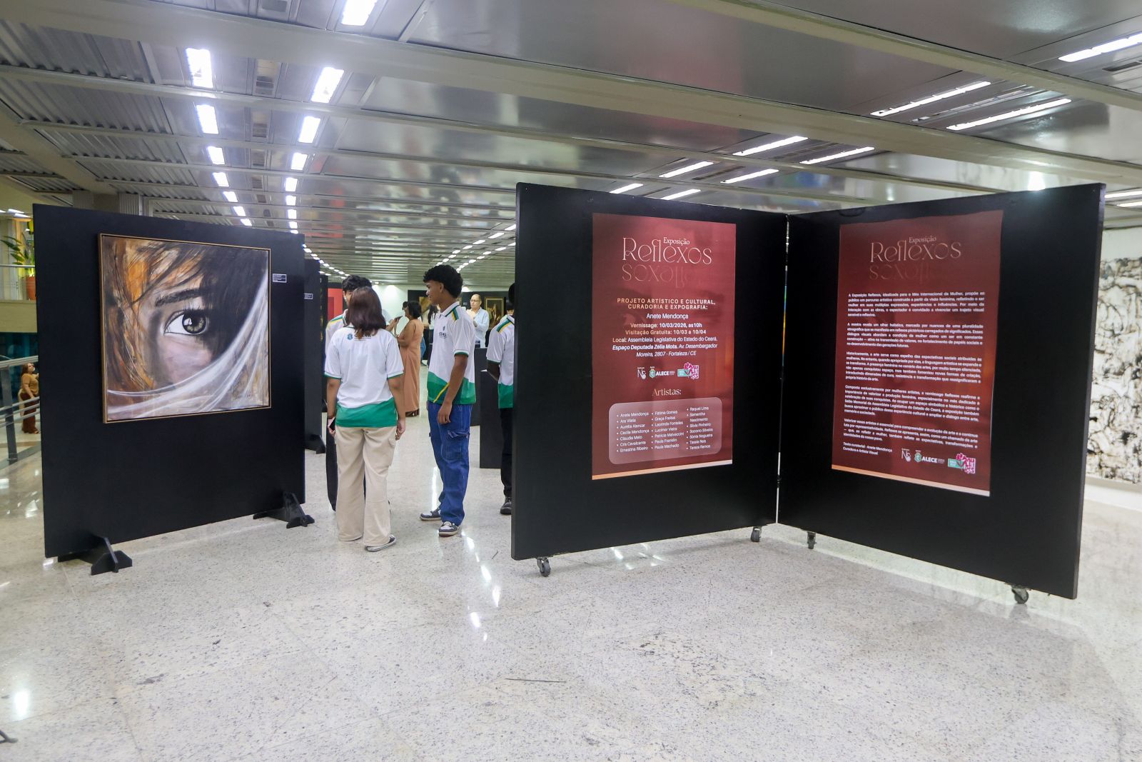 Quando mulheres criam, elas não apenas produzem arte, elas ampliam olhares e contam novas histórias. A partir dessa perspectiva, a Assembleia Legislativa do Estado do Ceará (Alece) realizou, nesta terça-feira (10/03), a abertura da exposição “Reflexos”, uma iniciativa do Memorial Deputado Pontes Neto (Malce) em parceria com o projeto “Entre Nós”, da curadora e artista visual Anete Mendonça. As obras permanecerão expostas no Espaço Deputada Zélia Mota até 10 de abril.